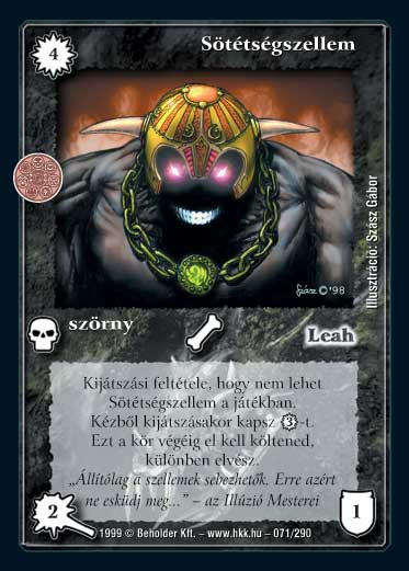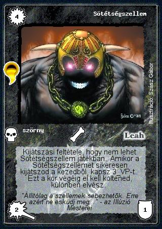 Kiadás: Aranyforrás, Túlélők Földje Gyakoriság: gyakori Lapszín (isten): Leah Típus: szörny Szöveg: Kijátszási feltétele, hogy nem lehet Sötétségszellem játékban. Amikor a Sötétségszellemet sikeresen kijátszod a kezedből, kapsz 3 VP-t. Ezt a kör végéig el kell költened, különben elvész. Szinesítő szöveg: "Állítólag a szellemek sebezhetők. Erre azért ne esküdj meg..." - az Illúzió Mesterei Illusztráció: Szász Gábor