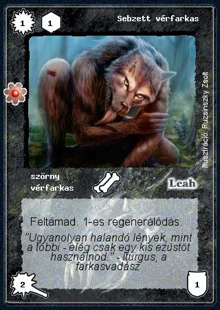 Kiadás: Rhatt fénykora Gyakoriság: gyakori Lapszín (isten): Leah Típus: szörny Altípus: vérfarkas Szöveg: Feltámad. 1-es regenerálódás. Szinesítő szöveg: "Ugyanolyan halandó lények, mint a többi - elég csak egy kis ezüstöt használnod." - Iturgus, a farkasvadász Illusztráció: Ruzsinszki Zsolt
