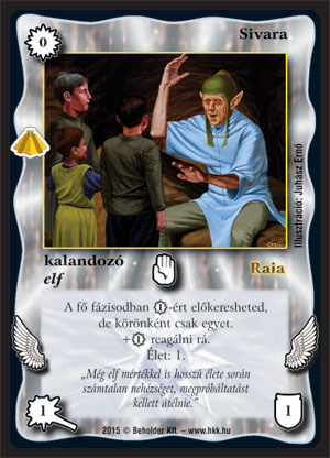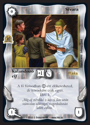 Kiadás: Zarknod visszatér, Alappakli, 10. kiadás Gyakoriság: ritka Lapszín (isten): Raia Típus: kalandozó Altípus: elf Szöveg: A fő fázisodban 1_VP-ért előkeresheted, de körönként csak egyet. +1_VP reagálni rá. Élet: 1. Szinesítő szöveg: "Még elf mértékkel is hosszú élete során számtalan nehézséget, megpróbáltatást kellett átélnie." Illusztráció: Juhász Ernő