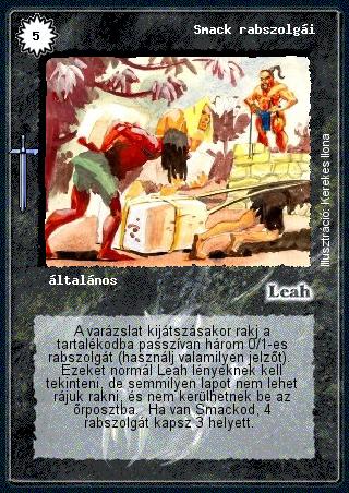 Szöveg: A varázslat kijátszásakor rakj a tartalékodba passzívan három 0/1-es rabszolgát (használj valamilyen jelzőt). Ezeket normál Leah lényeknek kell tekinteni, de semmilyen lapot nem lehet rájuk rakni, és nem kerülhetnek be az őrposztba. Ha van Smackod, 4 rabszolgát kapsz 3 helyett.