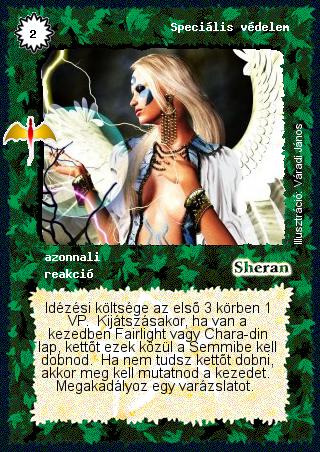Szöveg: Idézési költsége az első 3 körben 1 VP. Kijátszásakor, ha van a kezedben Fairlight vagy Chara-din lap, kettőt ezek közül a Semmibe kell dobnod. Ha nem tudsz kettőt dobni, akkor meg kell mutatnod a kezedet. Megakadályoz egy varázslatot.