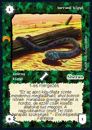 Szinesítő szöveg: "Ez az apró kígyófajta szinte mindenhol megtalálható, ahol bokrok nőnek. Harapása gyenge mérget is hordoz, de ezzel csak kisebb állatokat tud megölni. A nagyobbakhoz (mint Te) több harapás szükséges." - Enciklopedia Fantasia