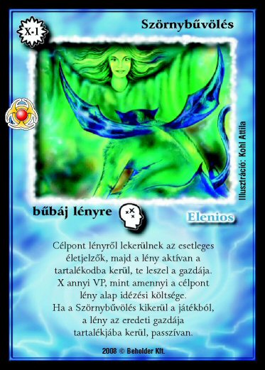 Kiadás: Újjászületés Gyakoriság: ritka Lapszín (isten): Elenios Típus: bűbáj lényre Altípus: - Szöveg: Célpont lényről lekerülnek az esetleges életjelzők, majd a lény aktívan a tartalékodba kerül, te leszel a gazdája. X annyi VP, mint amennyi a célpont lény alap idézési költsége. Ha a Szörnybűvölés kikerül a játékból, a lény az eredeti gazdája tartalékjába kerül, passzívan. Illusztráció: Kohl Attila