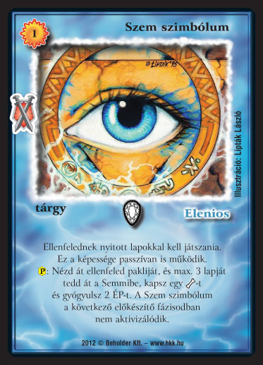 Kiadás: Istenek viadala Gyakoriság: nem gyakori Lapszín (isten): Elenios Típus: tárgy Szöveg: Ellenfelednek nyitott lapokkal kell játszania. Ez a képessége passzívan is működik. (P): Nézd át ellenfeled pakliját, és max. 3 lapját tedd át a Semmibe, kapsz egy _*-t és gyógyulsz 2 ÉP-t. A Szem szimbólum a következő előkészítő fázisodban nem aktivizálódik. Illusztráció: Lipták László