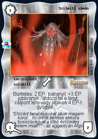 Kiadás: Víziók Gyakoriság: gyakori Lapszín (isten): Katona Klán Típus: torzszülött Altípus: szilmill Szöveg: Büntetés: 2 ÉP. balranyil: +3 ÉP. jobbranyil: "áldozd fel a lényt: célpont lény vagy játékos 4 ÉP-t gyógyul. ". Szinesítő szöveg: "Elszánt fanatikusokat látok magam körül... Ki öntött belétek ekkora bosszúvágyat a több évtizedes sérelem miatt?" - az aggastyán Afgori Illusztráció: