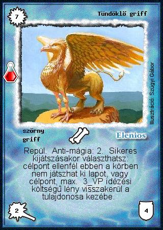 Kiadás: Esthar Császárság Gyakoriság: nem gyakori Lapszín (isten): Elenios Típus: szörny Altípus: griff Szöveg: Repül. Anti-mágia: 2. Sikeres kijátszásakor választhatsz: célpont ellenfél ebben a körben nem játszhat ki lapot, vagy célpont, max. 3 VP idézési költségű lény visszakerül a tulajdonosa kezébe. Illusztráció: