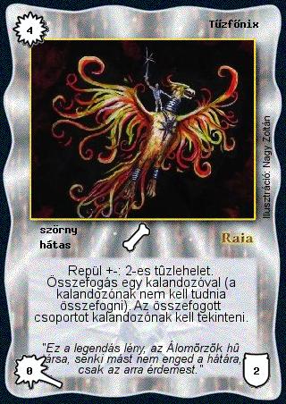 Kiadás: Alappakli, 2. kiadás, Alappakli, 3. kiadás, Alappakli, 4. kiadás Gyakoriság: gyakori Lapszín (isten): Raia Típus: szörny Altípus: hátas Szöveg: Repül +-: 2-es tűzlehelet. Összefogás egy kalandozóval (a kalandozónak nem kell tudnia összefogni). Az összefogott csoportot kalandozónak kell tekinteni. Szinesítő szöveg: "Ez a legendás lény, az Álomőrzők hű társa, senki mást nem enged a hátára, csak az arra érdemest." Illusztráció: Nagy Zoltán