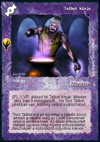 Szöveg: (P), 1 VP, áldozd fel Talbot kínját: Minden lény kap 3 méregjelzőt. Ha Torz Talbot játékban van, költség nélkül kijátszhatod.