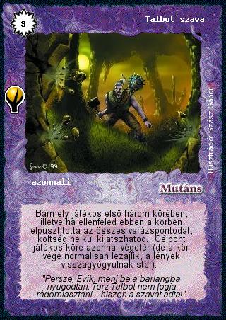 Kiadás: Alappakli, 5. kiadás (Ősök városa), Alappakli, 6. kiadás (Ősök Városa), Alappakli, 7. kiadás (Ősök Városa) Gyakoriság: ritka Lapszín (isten): Mutáns Klán Típus: azonnali Szöveg: Bármely játékos első három körében, illetve ha ellenfeled ebben a körben elpusztította az összes varázspontodat, költség nélkül kijátszhatod. Célpont játékos köre azonnal végetér (de a kör vége normálisan lezajlik, a lények visszagyógyulnak stb.). Szinesítő szöveg: "Persze, Evik, menj be a barlangba nyugodtan. Torz Talbot nem fogja rádomlasztani... hiszen a szavát adta!" Illusztráció: Szász Gábor