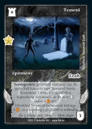 Kiadás: Promóciós lapok Gyakoriság: ritka Lapszín (isten): Leah Típus: építmény Szöveg: Semlegesítés: gyűjtőből kijátszott lap, ill. gyűjtőből használt vagy Semmiző forrás. Körönként 1 lényt a gyűjtődből is kijátszhatsz (feltámad), de ha nem _élőholt, akkor +(1)-ért. Ellenfeled Semmiző forrásainak költsége +(1), ez a képesség a gyűjtőből is működik. Szinesítő szöveg: "Én is féltem, amíg éltem." - Mork Augir Illusztráció: Ruzsinszki Zsolt