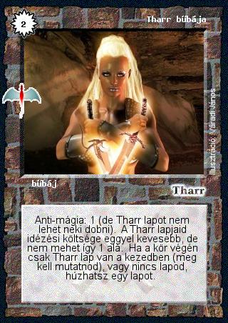 Kiadás: Sárkánymágia, Alappakli, 8. kiadás Gyakoriság: nem gyakori Lapszín (isten): Tharr Típus: bűbáj Szöveg: Anti-mágia: 1 (de Tharr lapot nem lehet neki dobni). A Tharr lapjaid idézési költsége eggyel kevesebb, de nem mehet így 1 alá. Ha a kör végén csak Tharr lap van a kezedben (meg kell mutatnod), vagy nincs lapod, húzhatsz egy lapot. Illusztráció: Váradi János