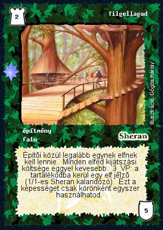 Kiadás: Ezüsthajnal Gyakoriság: nem gyakori Lapszín (isten): Sheran Típus: építmény Altípus: falu Szöveg: Építői közül legalább egynek elfnek kell lennie. Minden elfed kijátszási költsége eggyel kevesebb. 3 VP: a tartalékodba kerül egy elf jelző (1/1-es Sheran kalandozó). Ezt a képességet csak körönként egyszer használhatod. Illusztráció: Gőgös Károly