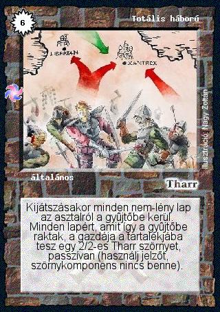 Kiadás: Létsíkok Gyakoriság: ritka Lapszín (isten): Tharr Típus: általános Szöveg: Kijátszásakor minden nem-lény lap az asztalról a gyűjtőbe kerül. Minden lapért, amit így a gyűjtőbe raktak, a gazdája a tartalékjába tesz egy 2/2-es Tharr szörnyet, passzívan (használj jelzőt, szörnykomponens nincs benne). Illusztráció: Nagy Zoltán
