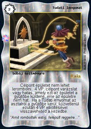 Kiadás: Létsíkok Gyakoriság: gyakori Lapszín (isten): Raia Típus: bűbáj építményre Szöveg: Célpont épületet nem lehet lerombolni. 4 VP: célpont varázslat vagy hatás, amely ezt az épületet a gyűjtőbe küldené, erre az épületre nem hat. Ha a Tudati lenyomat az asztalról a gyűjtőbe kerül, közvetlenül ezután 4 VP elköltésével visszaveheted a kezedbe. Szinesítő szöveg: "Amit romboltak estig, felépült reggelre..." Illusztráció: Prekop László