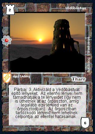 Kiadás: Rhatt fénykora Gyakoriság: nem gyakori Lapszín (isten): Tharr Típus: építmény Szöveg: Párbaj: 3. Aktivizáld a Védőbástyát építő lényeket. Az ellenfél lényei nem támadhatják a te lényeidet (így nem is üthetnek át az őrposzton, amíg legalább egy lényed van az őrposztodban). Az őrposztban tartózkodó lényeid nem lehetnek célpontjai az ellenfél hatásainak. Illusztráció: Váradi János