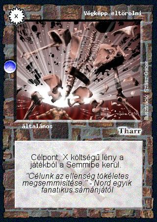 (AK37) A Quwarg szabotőrrel megakadályozhatomazt, hogy Végképp eltöröljék az Ősquwargomat. A gyűjtő és a Semmi szinte minden szempontból tökéletesen megegyezik, ha valami a gyűjtőbe kerüléskor csinál valamit, azt a Semmibe kerüléskor is megteszi. Az egyetlen különbség a gyűjtő és a Semmi között, hogy a Semmiből semmilyen módon nem kerülhet vissza lap, sem a játékba, sem a pakliba, kézbe vagy a gyűjtőbe. | (AK42) A Szent Kulacsot nem használhatom akkor, ha a hordozója nem ÉP-vesztéstől (pl. Végképp eltörölni) éppen a gyűjtőbe kerülne, mivel az nem teremti meg az életmentő hatáshoz szükséges helyzetet. A Szent Kulacsot abban az esetben is visszavehetem, ha nem sebződött a hordozója, de csak akkor, ha rajtam a cselekvés joga. | (AK49) Ha a Halálóriás a Semmibe kerülne (pl.: Végképp eltörölni, A halál angyala, stb.), akkor ugyanaz történik vele, mintha a gyűjtőbe kerülne. | (AK66) Az ellenfél kijátssza két varázspontért a Végképp eltörölnit a Molgant nevezve meg célpontként. Miután ennek a Tharr lapnak a célpontja bármilyen lény lehet, ezért én a Célpontválasztással átirányíthatom akár kalandozóba, akár galetkibe, avatárba stb. Az átirányítás után a lap hatása az lesz, hogy az X, jelen esetben kettő, idézési költségű lény a Semmibe kerül. Ha a Troll ladybe irányítom, akkor nem történik semmi, mivel annak az idézési költége három. Ha a Bölcs tanítóba irányítottam, akkor az meghal, mivel neki szintén kettő az idézési költsége. | (AK70) Az ellenfelemnek van egy Bohócmoladja és egy Ében íjásza. Megvédi-e a molad egy Végképp eltörölnitől az íjászt? Nos, egy lap kijátszásakor először megállapítom a célpontot. A Végképp eltörölni célpontja az íjász lesz, mivel a molad nem célozhatatlanná teszi a lényeimet, hanem az azokat ért káros hatásokat szívja magába. Ezután megállapítom az idézési költséget, ami ebben az esetben kettő. Majd kijátszom a lapot, és létrejön a hatás. Ekkor megnézem, hogy ez a hatás vonatkozhat-e a moladra. Ha igen, akkor csak a moladra hat, ha nem akkor rendesen kifejti hatását. Mivel két varázspontért játszottam ki, ezért a Végképp eltörölni egy kettes idézésű költségű lényt tud a gyűjtőbe küldeni. A moladé három, így rá nem hathat a varázslat, ezért az íjászra fog hatni, aki a gyűjtőbe kerül. |