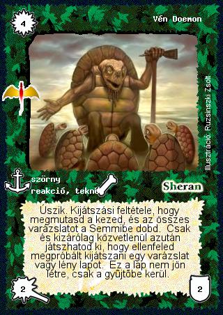 | (AK139) Teknősnek számít a Vén Doemon, amikor reakcióként kijátszom. Itt nem arról van szó, mint a szkritterek vagy a Dranadáni kőtörő esetében, ahol kijátszhatom a lapot varázslatként is, de akkor nem lény. Itt egy olyan teknős lényről van szó, amit reakcióként tudok kijátszani.