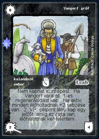 Szöveg: Nem kaphat szintlépést. Ha Vangorf vára áll, 1-es regenerálódást kap. Ha aktív, minden élőholtadnak +2 sebzése van. 2 VP: célpont lény kap egy jelzőt, amíg ez rajta van, élőhalottnak kell tekinteni.