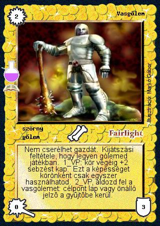Kiadás: Enkala laboratóriuma (Zén) Gyakoriság: ritka Lapszín (isten): Fairlight Típus: szörny Altípus: gólem Szöveg: Nem cserélhet gazdát. Kijátszási feltétele, hogy legyen gólemed játékban. 1 VP: kör végéig +2 sebzést kap. Ezt a képességet körönként csak egyszer használhatod. 2 VP, áldozd fel a vasgólemet: célpont lap vagy önálló jelző a gyűjtőbe kerül. Illusztráció: Markó Gábor