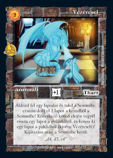 Kiadás: Hódítások Gyakoriság: ritka Lapszín (isten): Tharr Típus: azonnali Szöveg: Áldozd fel egy lapodat és rakd a Semmibe, ezután dobj el 1 lapot a kezedből a Semmibe! Következő köröd elején vegyél vissza egy lapot a gyűjtődből, és keress ki egy lapot a paklidból (kivéve Vezércselt)! Kijátszása után a Semmibe kerül. Szinesítő szöveg: "d4, d5, c4" Illusztráció: Kovács József