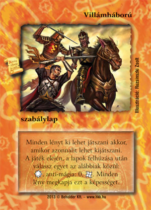Kiadás: Világégés Gyakoriság: ultra ritka Lapszín (isten): Színtelen Típus: szabálylap Altípus: - Szöveg: Minden lényt ki lehet játszani akkor, amikor azonnalit lehet kijátszani. A játék elején, a lapok felhúzása után válassz egyet az alábbiak közül: ősmágia, anti-mágia: 0, _háló. Minden lény megkapja ezt a képességet. Illusztráció: Ruzsinszki Zsolt