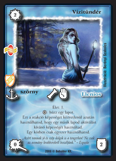 Kiadás: Tengermély Gyakoriság: ritka Lapszín (isten): Elenios Típus: szörny Szöveg: Élet: 1. 0_VP: húzz egy lapot. Ezt a reakció képességet közvetlenül azután használhatod, hogy egy másik lapod aktiválást kívánó képességét használtad. Egy körben csak egyszer használhatod. Szinesítő szöveg: "Azért vannak jó és szép dolgok is a tengerben! Ne csak az ocsmány krabberekr?l beszéljünk." - Espada Illusztráció: Berényi Szabolcs