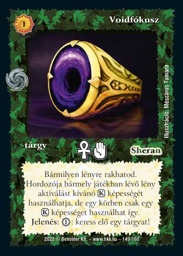 Kiadás: Résföld Gyakoriság: nem gyakori Lapszín (isten): Sheran Típus: tárgy Szöveg: Bármilyen lényre rakhatod. Hordozója bármely játékban lévő lény aktiválást kívánó (K) képességét használhatja, de egy körben csak egy (K) képességet használhat így. Jelenés: 1_VP: keress elő egy tárgyat! Illusztráció: Mészáros Tamara