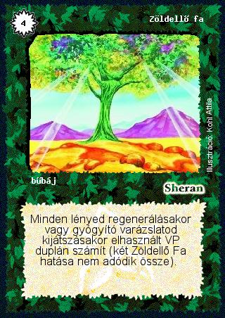 (AK1) Zöldellő fa mellett 1-es regenerálódásnál 2 VP-ért 4 ÉP-t, 2-es regenerálódásnál 4 VP-ért 4 ÉP-t regenerálhat a lény, tehát továbbra sem regenerálhat 4 ÉP-nél többet egy körben, mindössze ezt olcsóbban teheti. | (AK1) Ha ugyanabból a lapból többet kijátszok, akkor amennyiben a lap ezt egyértelműen nem tiltja (pl. Zöldellő fa), és a hatások összeadódásának van értelme, akkor összeadódnak a hatások. Pl. összeadódik két, ugyanarra a lényre rakott Óriáserő, ha kint van két Agytaposás, akkor az ellenfél kettővel kevesebb VP-t kap stb. Definíció szerint az azonos típusú felszerelési tárgyakból (páncél, fegyver, sisak stb.) csak egyet lehet egy lényre rakni. | (AK18) A Zöldellő fa a gyógyító varázslatokat csak a kijátszásukkor segíti, két Átcsoportosítás pedig nem adódik össze, a VP-dért csak egyszer kaphatsz ÉP-t. Ezért Zöldellő fa és két Átcsoportosítás esetén is hármat fogsz gyógyulni, ha csak 5 VP-t kapnál a kör elején. | (AK4) Megkülönböztetünk alap és módosított idézési költséget. Egy lapnak az alap idézési költsége az a szám, amely a bal felső sarkába van írva. Amennyiben itt ? vagy X szerepel, illetve a kártya szövege szerint a bal felső sarokba írt számon kívül még további VP-t kell elkölteni, akkor az alap idézési költség a megfelelő behelyettesített érték. Ha a lap nincs játékban (a gyűjtőben, a pakliban, vagy a kézben van), akkor az X-et illetve a pluszban költendő VP-t nullának kell számolni. A ?-nél pedig a lehető legkisebb érték (pl. Tolvajszemnél 1). A módosított idézési költség az alap idézési költségnek játékban levő lapokkal módosított értéke. Ilyen lap lehet pl. egy templom, A béke erdeje, Agyzavarás. A legtöbb idézési költséget említő lap az alap idézési költségre vonatkozik. Néhány kivétel van, mint például a Manacsapda: ha mondjuk kint van egy Sheran temploma, és valaki kijátszik egy Tűzesőt 7+1 VP-ért, a Manacsapdára a módosított idézési költséget (8-at) kell elkölteni, és a templom miatt a Manacsapda idézési költsége eggyel nagyobb, tehát összesen 9-be fog kerülni. Példa az alap idézési költségre: kint van egy Zan-indukátor, kezemben van egy Azonnali gyógyítás. Amíg az Azonnali gyógyítás a kezemben van, addig az alap idézési költsége 2. Kijátszom, gyógyítok 3 ÉP-t, tehát 5 VP-t kell költenem: a kijátszás pillanatában tehát az Azonnali gyógyításom alap idézési költsége 5. A Zan-indukátor miatt eggyel kevesebb VP-t kell költenem, tehát a módosított idézési költség 4. (Figyelem: a Zöldellő fa az idézési költséget nem befolyásolja, csak a varázslat hatását!) | (AK5) és (AK15) Ha Zöldellő fád van játékban, minden, gyógyító varázslatra költött VP-d duplán számít. Tehát egy 4-et gyógyító azonnali gyógyítás 3 VP-be kerül, egy Hódolat Raiának 2 VP-be kerül stb. Ilyenkor ezt a kevesebb VP-t kell a módosított idézési költségnek tekinteni, tehát a Manacsapdázása is fele VP-be kerül. | (AK8) A Zöldellő fa nem segíti a Virág szimbólum használatát, mivel a Zöldellő fa csak lények regenerálását és gyógyító varázsaltok kijátszását segíti elő, és a Virág szimbólum használata nem tartozik egyik csoportba sem. |
