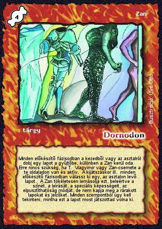 (AK1) Ha a Zan lény alakban van, és elpusztul, annyi szörnykomponens nyerhető ki belőle, mint a másolt lényből. | (AK1) Ha a Zan lény alakban van, és méregjelzőt kap, átalakulhat tárggyá vagy egyéb, nem mérgezhető lappá, mielőtt meghal, így a méregjelzők leesnek. | (AK1) Ha a Zant valaki átveszi Szörnybűvöléssel, a Zan mindaddig nála marad, amíg a Zan lény marad. Ha a Zan átváltozik valami mássá, a Szörnybűvölés automatikusan leesik róla, és a Zan visszakerül eredeti gazdájához. | (AK1) Ha leesik a lap, amelyet a Zan másolt, ez a Zant semmilyen formában nem érinti. | (AK3) Összefogás: Klónozással, Zannal vagy más módon másolni mindig csak egy bizonyos (fizikai) kártyalapot lehet, összefogott lénycsoportot nem. | (AK3) Klónozással, Zannal vagy más módon másolni mindig csak egy bizonyos (fizikai) kártyalapot lehet, összefogott lénycsoportot nem. | (AK32) Az alakváltó lapok mindig a lap aktuális állapotát másolják, de természetesen csak a permanens változásokat kell beleszámítani az aktuális állapotba. Azaz ha egy Általános randomizációval átírok egy A szirének énekét, és utána Bűbájmásolom, akkor a másolással az átírt lapot másolom le, de ha a Zan alakulna át egy olyan lénnyé, ami éppen sebesült, akkor természetesen a sebesülést nem másolja le. | (AK32) Az alakváltó lapok szabályai szerint az alakváltó lapok (ilyen pl. a Bűbájmásolás, Zan, Dort Amessix) csak az idézési költségüket, esetleg ha a lapon külön szerepel, akkor a színűket tartják meg, egyébként minden szempontból tökéletesen lemásolják a célpont lapot. Tehát ha Bűbájmásolással másolok Agyzavarást, majd az ellenfelem Kiegyenlítéssel a gyűjtőbe küldi az Agyzavarásokat, a másolt zavarások is a gyűjtőbe kerülnek. | (AK33) A Kisebb Zan is Zannak számít, ezért ha játékban van, használni lehet T. Vlagyimir képességét, és ki lehet játszani az Óriásférget. | (AK5) Ha valaki Klónozással, Zannal másol stb. nem kell teljesíteni a speciális kihozási feltételt (pl. Zarknodnál lény dobása). | (AK8) Van a játékban egy Zanom és egy T. Vlagyimirem. A Zan felveszi egy Piromenyét alakját, majd az így kapott szörnyet elbűvölik. Mikor változhat a Zan, mi történik, ha más lappá alakul, és működik-e T. Vlagyimirem speciális képessége? Azzal, hogy az ellenfél elbűvölte a szörny- Zant, ő lett a lap gazdája. A Zan csak az ő előkészítő fázisában változhat, neki kell a fenntartási költséget fizetnie (lapdobás), amennyiben más alakot választ neki, és az nem szörny, a Szörnybűvölés leesik róla, és a lap az eredeti gazdájához kerül vissza. Amíg az ellenfélnél van a Zan, addig T. Vlagyimir speciális képessége nem működik. | (AK90) Milyen lapokat lehet másolni az alakváltó lapokkal? Nos, ez magától az alakváltó laptól is függ, pl. a Illúziópalotával csak épületet, Duplikátummal csak tárgyat stb. Persze vannak olyan lapok, pl. Zan, Kisebb Zan, amikkel majdnem mindenfajta lapot másolhatok. Azonban ezek is csak asztalon maradó lapot tudnak másolni, tehát általános vagy azonnali varázslatot nem. Ugyanígy nem másolhatók velük szabálylapok, helyszínek vagy követők. |