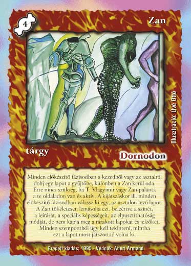 Szöveg: Minden előkészítő fázisodban a kezedből vagy az asztalról dobj egy lapot a gyűjtőbe, különben a Zan kerül oda. Erre nincs szükség, ha T. Vlagyimir vagy Zan-csemete a te oldaladon van és aktív. A kijátszáskor ill. minden előkészítő fázisodban válassz ki egy, az asztalon levő lapot. A Zan tökéletesen lemásolja ezt, beleértve a színét, a leírását, a speciális képességeit, az elpusztíthatóság módját, de nem kapja meg a rárakott lapokat és jelzőket. Minden szempontból úgy kell tekinteni, mintha ezt a lapot most játszottad volna ki.