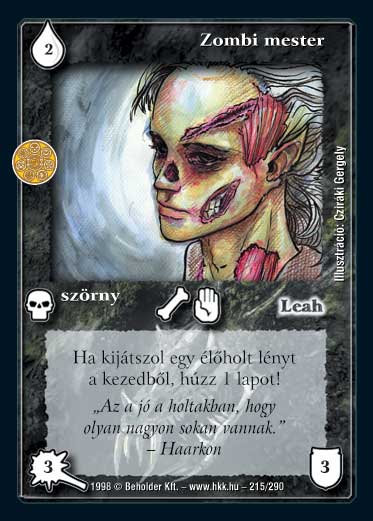 Hatalom Kártyái kártyalap - Zombi mester(AK110) Nem húzhatok lapot a Zombi mesterrel, ha a Temetővel (új) hozok vissza élőholt lényt a gyűjtőből. A Zombi mesternél csak kézből kijátszáskor húzhatok. A Temetőn (új) valóban szerepel, hogy a gyűjtőből úgy játszom ki az élőholtakat, mintha a kezemből játszanám ki, de ez arra vonatkozik, hogy a kijátszott lapok hatásai úgy jönnek létre, illetve még azt is jelenti, hogy lehet rá reakcióval reagálni. Ettől azonban még nem lesz kézből kijátszás, így azok a dolgok, amik kézből kijátszásra vonatkoznak, ebben az esetben nem működnek.