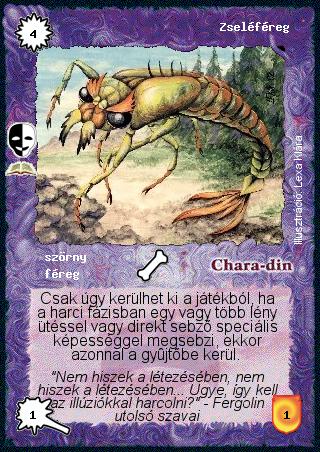 Kiadás: Tükörvilág (Zén) Gyakoriság: ritka Lapszín (isten): Chara-din Típus: szörny Altípus: féreg Szöveg: Csak úgy kerülhet ki a játékból, ha a harci fázisban egy vagy több lény ütéssel vagy direkt sebző speciális képességgel megsebzi, ekkor azonnal a gyűjtőbe kerül. Szinesítő szöveg: "Nem hiszek a létezésében, nem hiszek a létezésében... Ugye, így kell az illúziókkal harcolni?" - Fergolin utolsó szavai Illusztráció: Lexa Klára