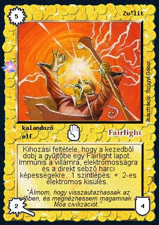 Szöveg: Kihozási feltétele, hogy a kezedből dobj a gyűjtőbe egy Fairlight lapot. Immúnis a villámra, elektromosságra és a direkt sebző harci képességekre. 1 szintlépés: +: 2-es elektromos kisülés.