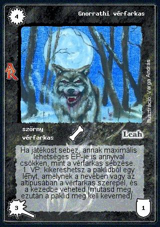 Szöveg: Ha játékost sebez, annak maximális lehetséges ÉP-je is annyival csökken, mint a vérfarkas sebzése. 1 VP: kikereshetsz a paklidból egy lényt, amelynek a nevében vagy az altípusában a vérfarkas szerepel, és a kezedbe veheted (mutasd meg, ezután a paklid meg kell keverned).