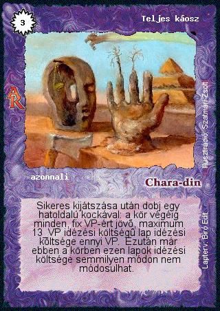 Kiadás: Alanori Krónika Gyakoriság: ritka Lapszín (isten): Chara-din Típus: azonnali Szöveg: Sikeres kijátszása után dobj egy hatoldalú kockával: a kör végéig minden, fix VP-ért jövő, maximum 13 VP idézési költségű lap idézési költsége ennyi VP. Ezután már ebben a körben ezen lapok idézési költsége semmilyen módon nem módosulhat. Illusztráció: Szatmári Zsolt Tervező: Bíró Edit
