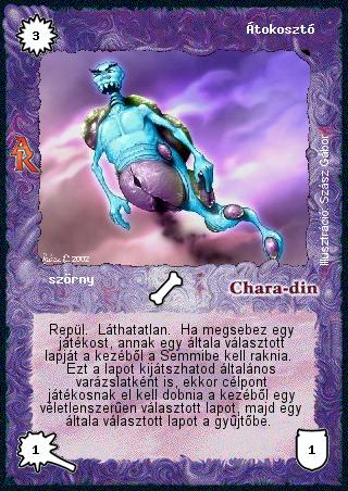 Kiadás: Alanori Krónika Gyakoriság: ritka Lapszín (isten): Chara-din Típus: szörny Szöveg: Repül. Láthatatlan. Ha megsebez egy játékost, annak egy általa választott lapját a kezéből a Semmibe kell raknia. Ezt a lapot kijátszhatod általános varázslatként is, ekkor célpont játékosnak el kell dobnia a kezéből egy véletlenszerűen választott lapot, majd egy általa választott lapot a gyűjtőbe. Illusztráció: Szász Gábor