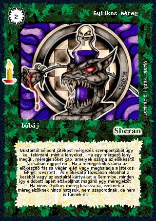Kiadás: Múltidéző, Alappakli, 8. kiadás Gyakoriság: ritka Lapszín (isten): Sheran Típus: bűbáj Szöveg: Mostantól célpont játékost mérgezés szempontjából úgy kell tekinteni, mint a lényeket. Ha egy mérgező lény megüti, méregjelzőket kap, amelyek száma az előkészítő fázisában eggyel nő. Ha a méregjelzők száma az előkészítő fázisa végén eléri vagy meghaladja a játékos ÉP-jét, vesztett. Az előkészítő fázisában eldobhat a kezéből vagy az asztalról kártyákat a Semmibe, minden így eldobott lapért eltávolíthat magáról egy méregjelzőt. Ha nincs Gyilkos méreg kirakva rá, ezeknek a méregjelzőknek nincs hatásuk, nem szaporodnak, de nem is tűnnek el. Illusztráció: Lipták László