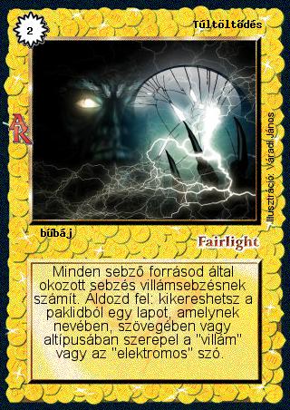 Kiadás: Alanori Krónika Gyakoriság: ritka Lapszín (isten): Fairlight Típus: bűbáj Szöveg: Minden sebző forrásod által okozott sebzés villámsebzésnek számít. Áldozd fel: kikereshetsz a paklidból egy lapot, amelynek nevében, szövegében vagy altípusában szerepel a "villám" vagy az "elektromos" szó. Illusztráció: Váradi János