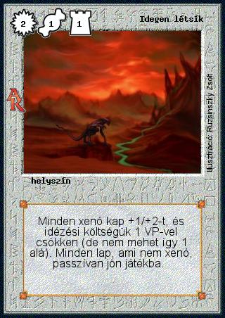 Kiadás: Alanori Krónika Gyakoriság: ritka Lapszín (isten): Színtelen Típus: helyszín Szöveg: Minden xenó kap +1/+2-t, és idézési költségük 1 VP-vel csökken (de nem mehet így 1 alá). Minden lap, ami nem xenó, passzívan jön játékba. Illusztráció: Ruzsinszki Zsolt