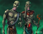 Nemrégiben egy mocsári láz járvány söpört végig a Kalandok Földjén. A kalandozók hetekig rosszul érezték magukat, míg a láz csillapult valamelyest, és ez bizony kihatással volt az életük minden területére. E betegségnek azonban létezik egy kevésbé könnyed lefolyású mutációja is, melynek végső stádiuma a halál. A képen két ebben szenvedő kalandozót láthatunk!